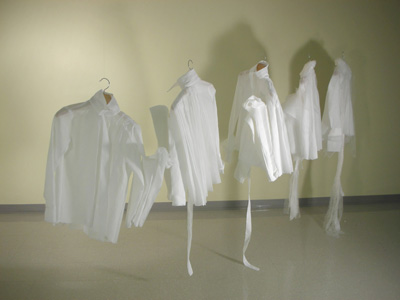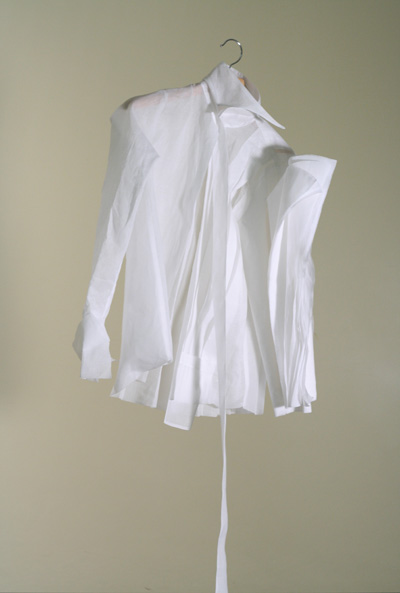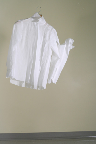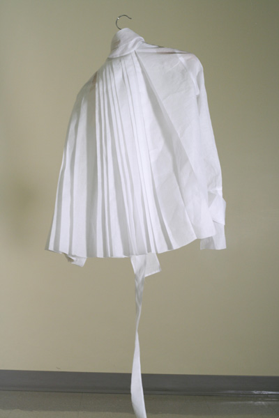 Statistics and social criticism meet in the style variation project Indice de l’indifférence. Ten unconventional white shirts were created using data from online surveys, specifically the number of times the option “I’m indifferent” has been recorded to answer a question. The entire pattern was altered by the compiled data (which was transferred using programming language Lingo), including the angle of the collar, the length of the pocket and the depth of the folds. Ying Gao’s shirts reflect society’s indifference to a wide array of cultural, political and social issues.
