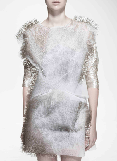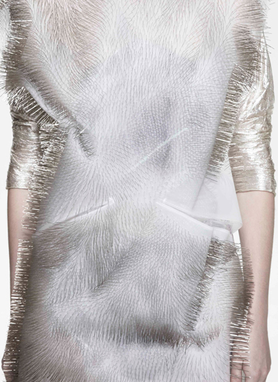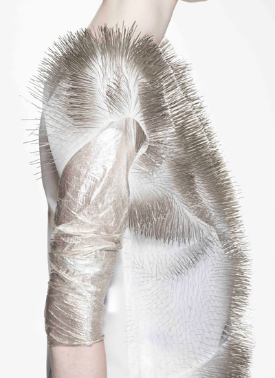 Emphasis is placed on the idea of ultra-reactivity functioning as a reflex movement: the garments model uncertainty as a form of indeterminacy by which an object or a perception can be transformed in various ways, become something else. The variability of the clothes, never entirely stable or definitive, is likely to arouse the spectator's anxiety. In front of these clothes, with thousands of long pins passing through them - pointing outwards - uncertainty becomes reciprocal. The unpredictability of human relations, whose only constant is change, the flow - in this case that of speech: its intonation, its volubility - is then what causes the clothes to react. They change shape and pattern, expand and contract, manifesting a form of undulating conversation that incorporates the spectator into their choreography.