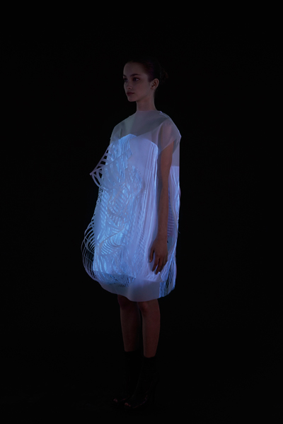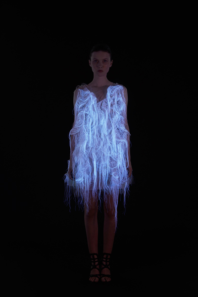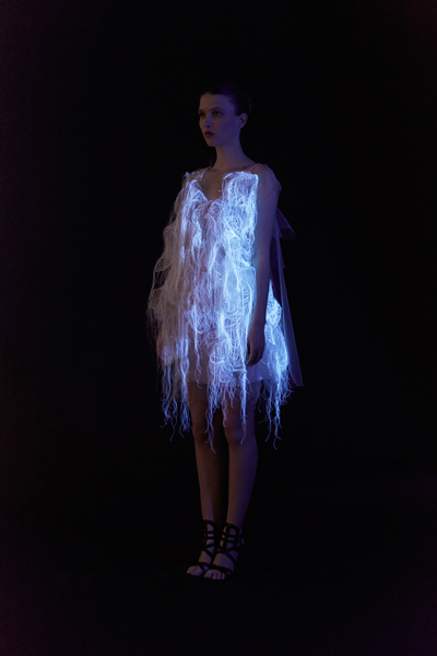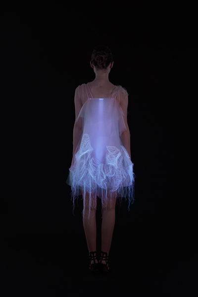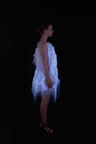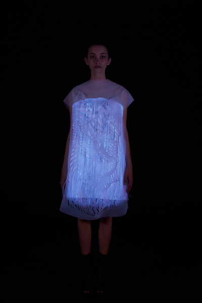 2 interactive dresses, Super organza, photoluminescent thread, PVDF, electronic devices.