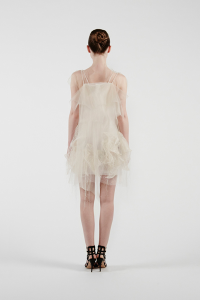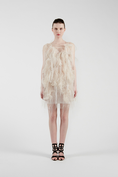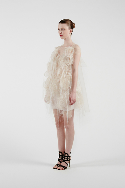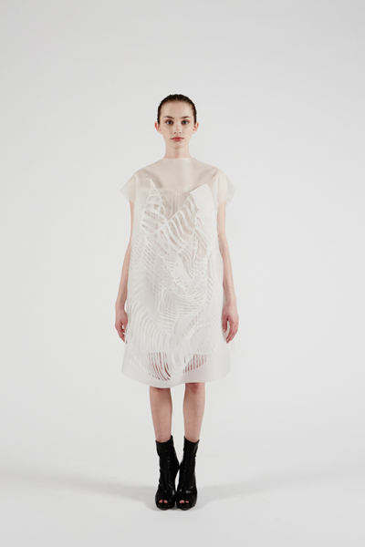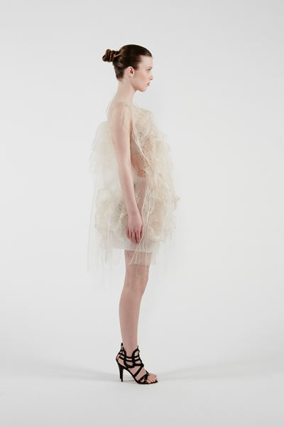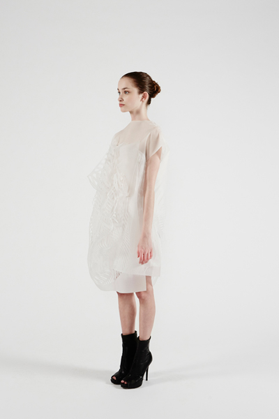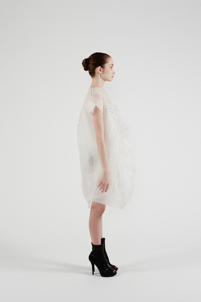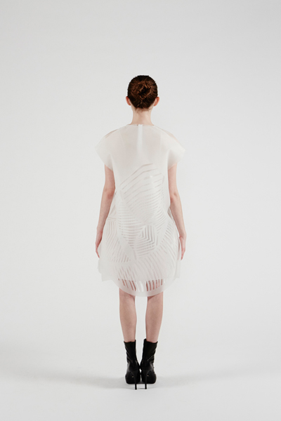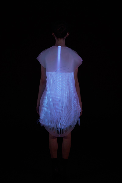 The series comprising two (2) dresses, made of photoluminescent thread and imbedded eye tracking technology, is activated by spectators' gaze. A photograph is said to be “spoiled” by blinking eyes – here however, the concept of presence and of disappearance are questioned, as the experience of chiaroscuro (clarity/obscurity) is achieved through an unfixed gaze.