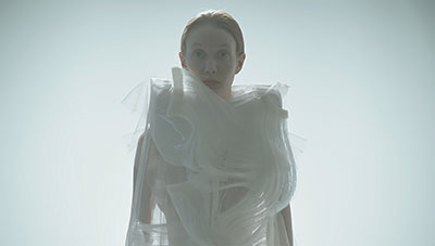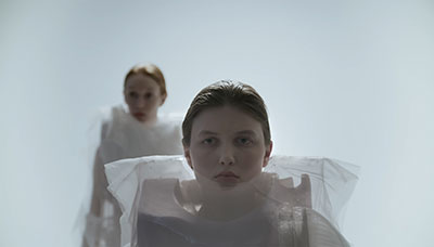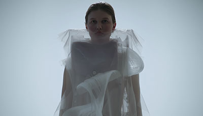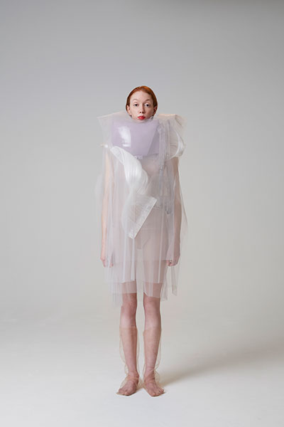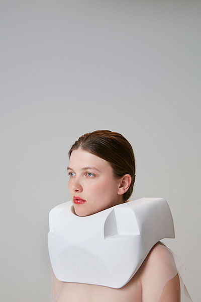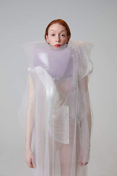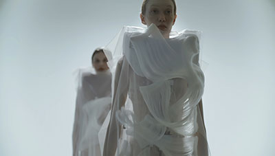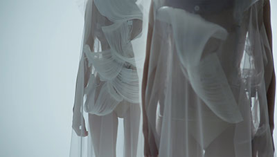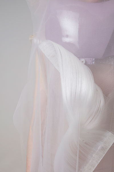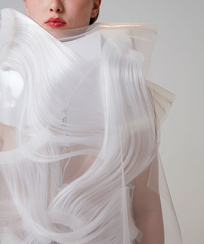 The aesthetic and motion of these garments evoke hypotrochoids, shapes borrowed from the vintage game Spirograph: their flattened curves are drawn by a single point linked to a mobile circle that rolls without sliding, on and inside of an initial circle. This design was developed from a series of algorithms linked to the realm of pattern recognition, or scatter graph.