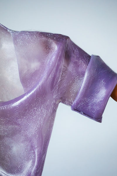 With Purple Skin, Ying Gao works with artificial skin she fashioned herself using complex construction methods, partially shifting the garments from prêt-à-porter to object of fictional design. This imitated skin can take on different configurations and fall under various material frameworks. Through this fluidity, the skin re-appropriates a given material’s properties, becoming it but also taking on new meanings. The silicon, glass, and 20-micron poly used lend themselves to sewing, shaping, and thermal construction—thereby ambivalently evoking skin folds and wounds.